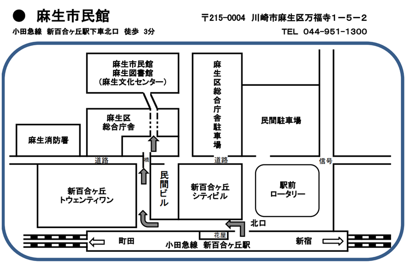 - 会場 :麻生市民館2階 大会議室 川崎市麻生区万福寺1-5-2 (麻生図書館と合築の麻生文化センター内)